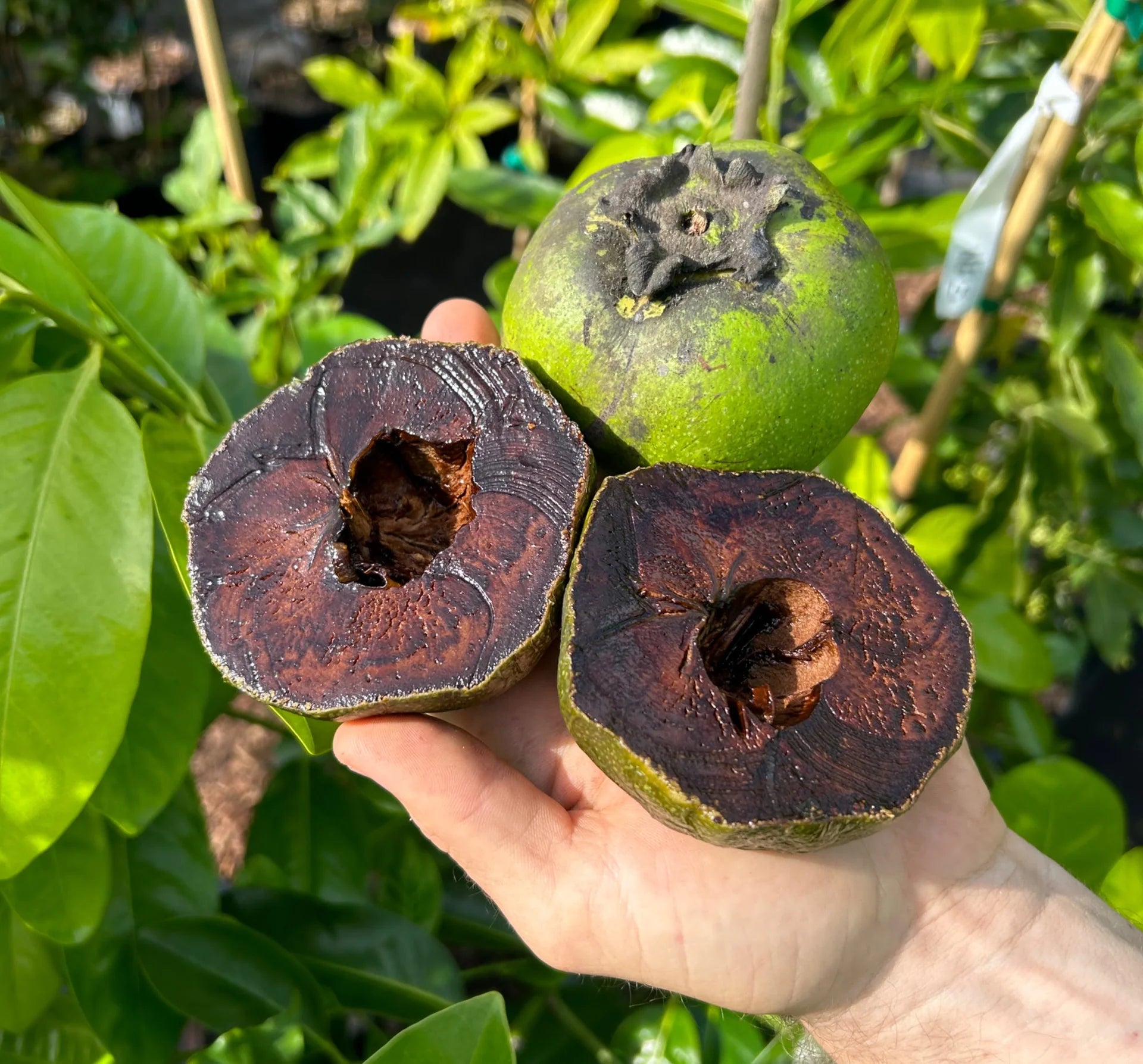 Black Sapote Colossal is a premium seedling selection from Kyogle, renowned for producing exceptionally large fruit. This self-pollinating variety yields seedless fruit when unpollinated, making it ideal for home gardeners. The glossy-foliaged tree is closely related to the Persimmon and thrives in tropical climates. Its creamy, chocolate-brown flesh earns it the nickname 'Chocolate Pudding Fruit'—best enjoyed as a decadent dessert topped with cream and a splash of rum or vanilla. A stunning ornamental addition that delivers both visual appeal and delicious harvests.