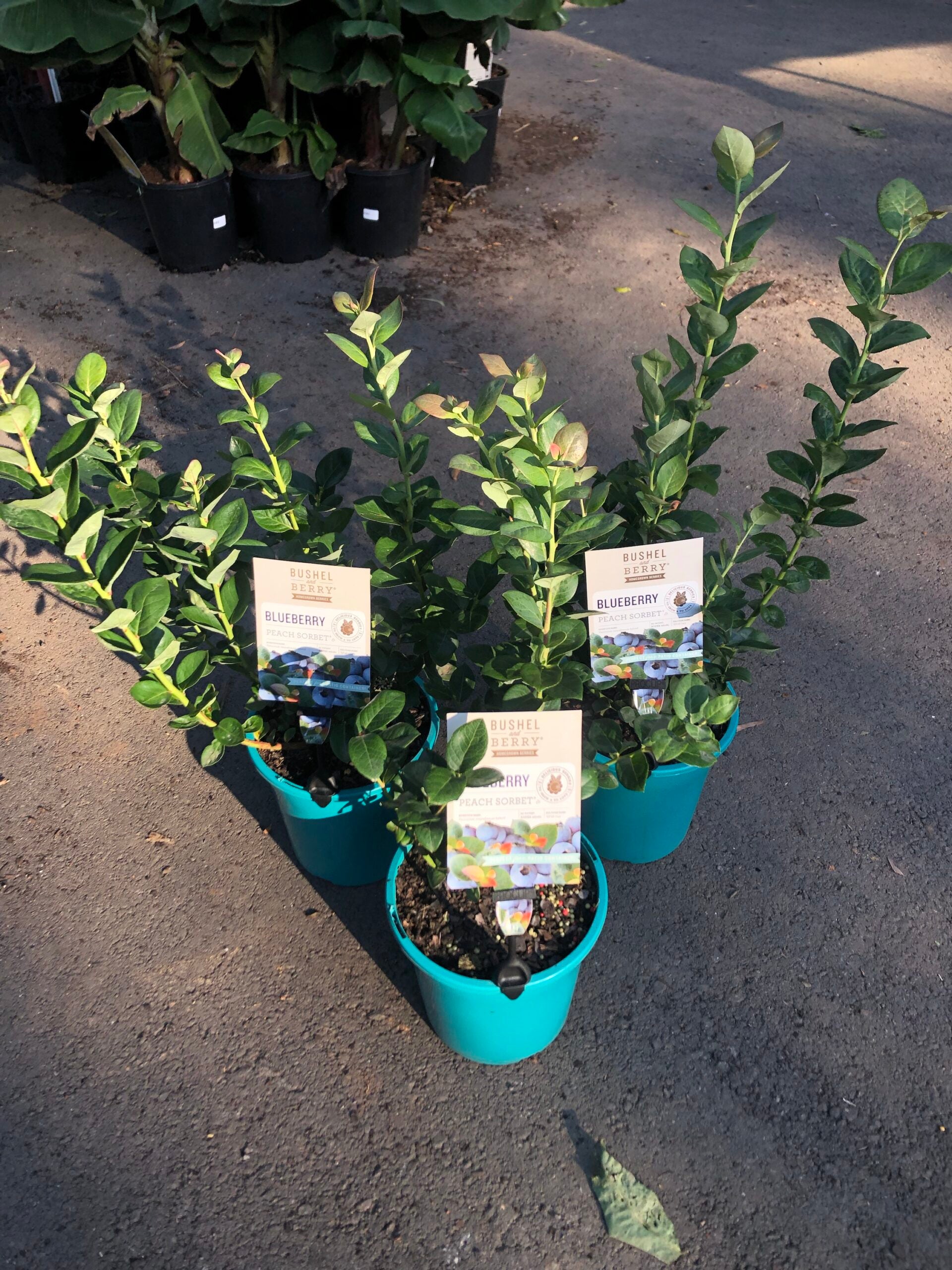 Peach Sorbet® is a compact blueberry with stunning peach, pink, orange and emerald green leaves. White bell-shaped flowers appear in spring, leading to an abundant summer crop of blueberries. In most climates, this plant will keep its leaves throughout winter and turns a rich eggplant purple!