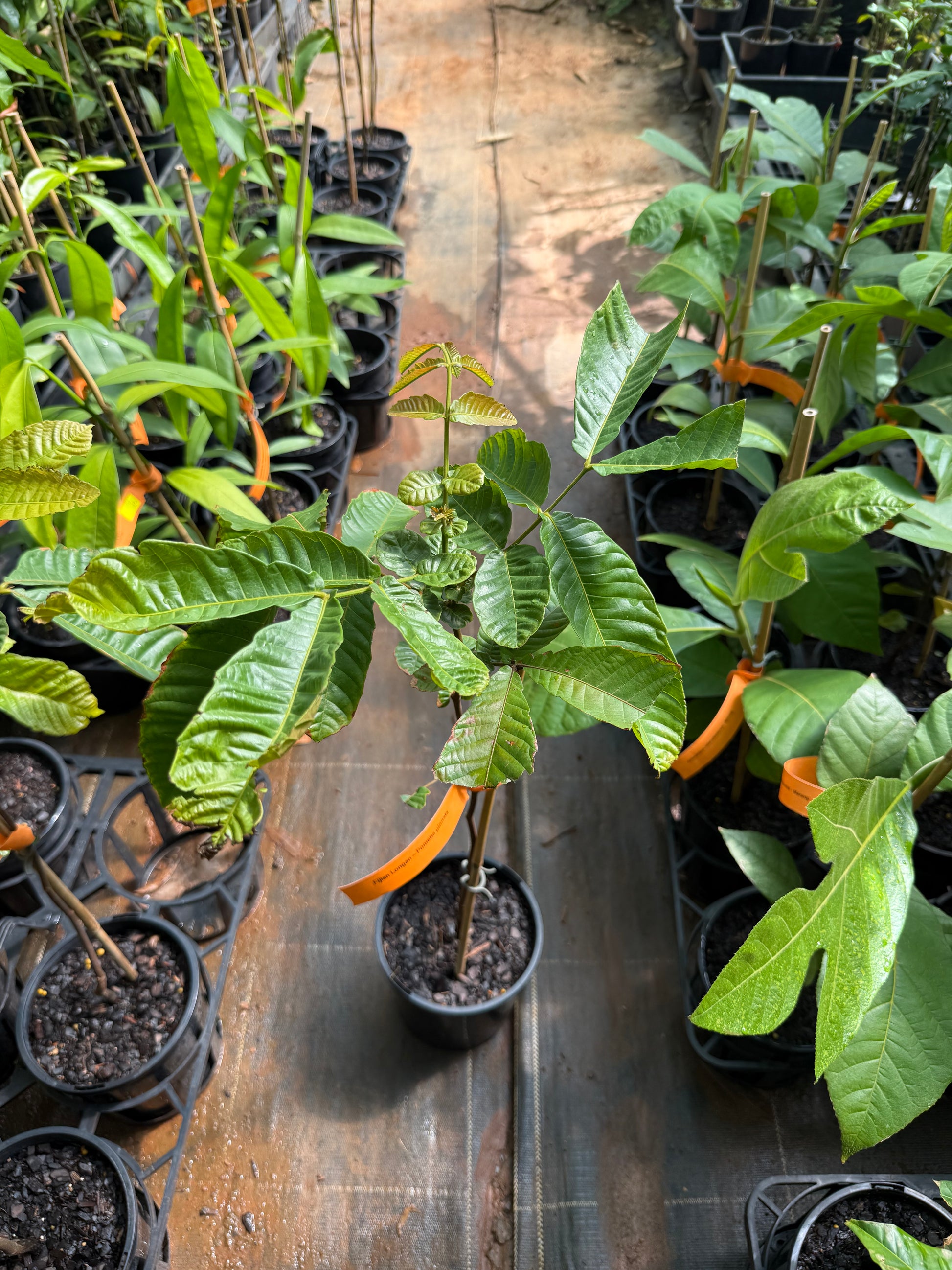 The Fijian Longan also known as the Island Lychee this is a large spreading tree reaching upto 20m. The round fruits have a thin skin that can be green to red and in some cases almost black when they are fully ripe. The flesh is juicy and sweet, it surrounding a single large seed. Fruiting occurs sporadically throughout the year with the main crop coming as late as July - August. Best suited to tropical areas as will not tolerate temps below 5 or frosts.